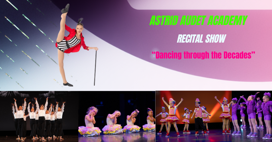 Welcome to the Astrid Audet Academy of Ballet and More’s annual recital production as we celebrate our 20th Year Anniversary! This year we invite you to step into the Party as we celebrate “Dancing Through The Decades” in the 20th and 21st centuries. You will be entertained by famous songs and themes from all genres of dance so be prepared to be amazed by a vibrant celebration of dance, music, and artistry.